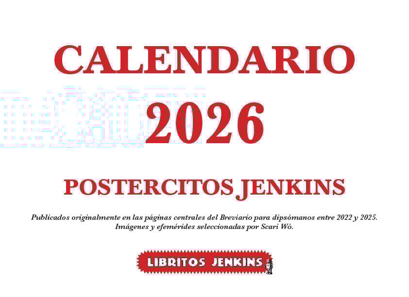 Por segundo año consecutivo, Libritos Jenkins pone en circulación, de forma limitada y a tiempo de decorar tu pared favorita, el calendario del año próximo. Obra de Scari Wó, recopila 12 de las imágenes que desde 2022 ha utilizado como póster central del fanzine Breviario para Dipsómanos, y cada día ofrece la efeméride o acontecimiento más importante para cualquier seguidor de Libritos Jenkins que se precie. Tanto si necesitas un almanaque de estos para señalar tus citas con el proctólogo, como si quieres regalárselo a alguien al azar o simplemente para apoyar a esta editorial al borde de la indigencia, este es el producto ideal.